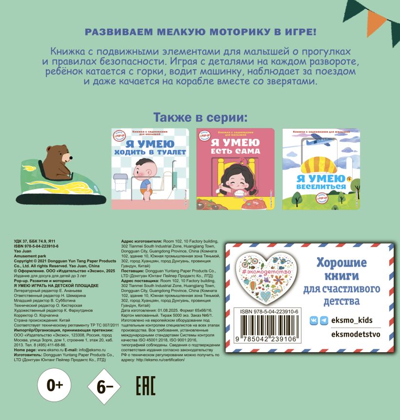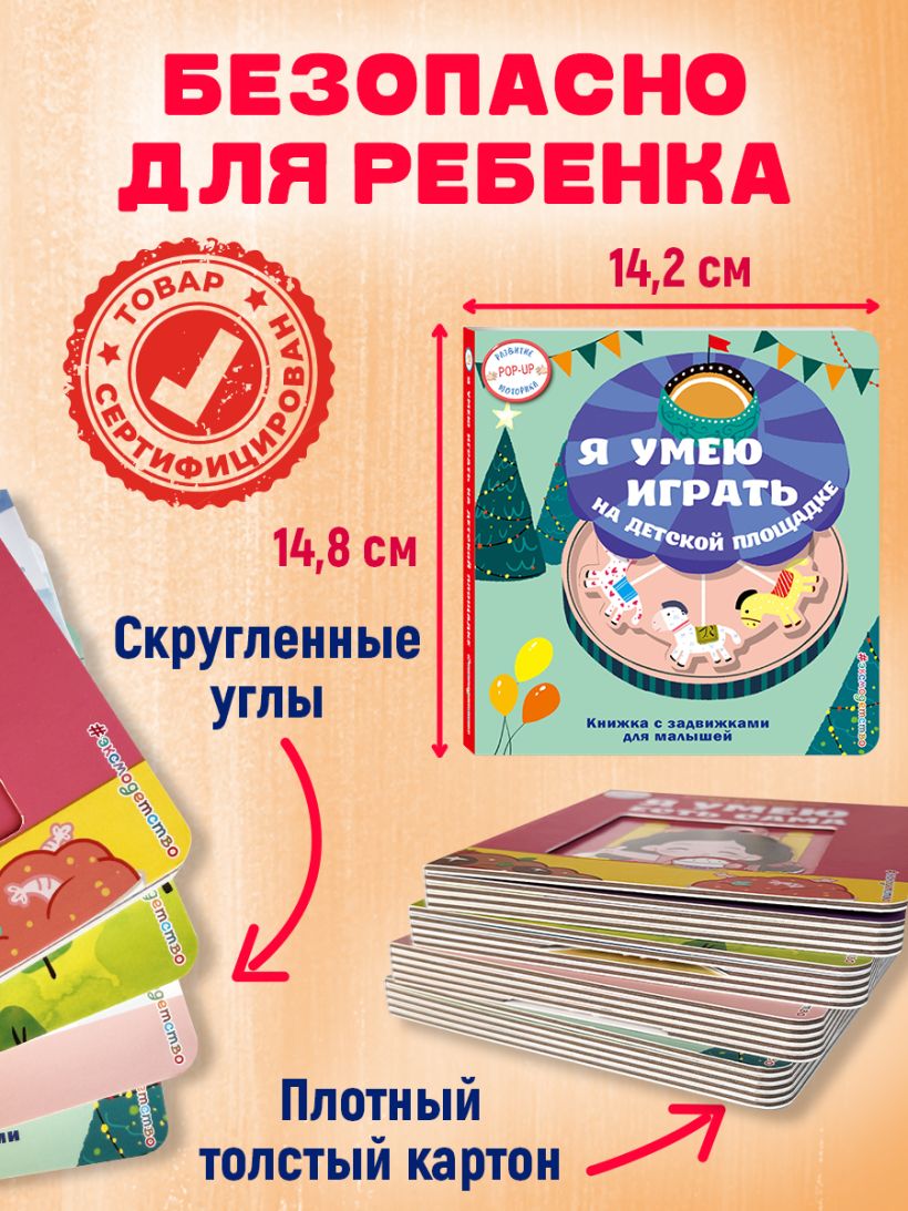 Все страницы и элементы книги имеют безопасную скруглённую форму и сделаны из прочного толстого картона — очень удобно для маленьких ручек! А компактный формат позволяет играть с книгой не только дома, но и легко брать её с собой на прогулку или в детский садик.