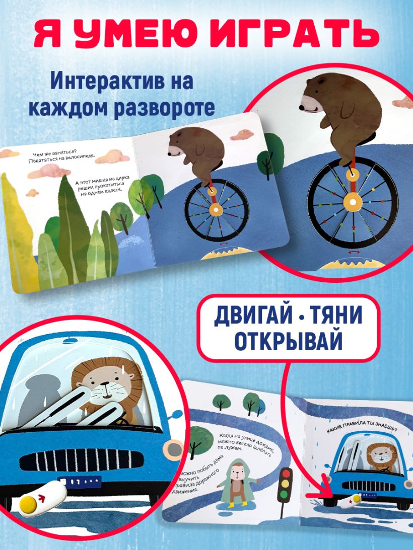 Игра с книгой начинается прямо с обложки, ведь там находится первая подвижная деталь! Яркие простые картинки с весёлыми животными обязательно заинтересуют ребёнка, а интерактивные элементы сделают игру с книгой ещё увлекательнее. Рассматривайте картинки с малышом и придумывайте свои истории!