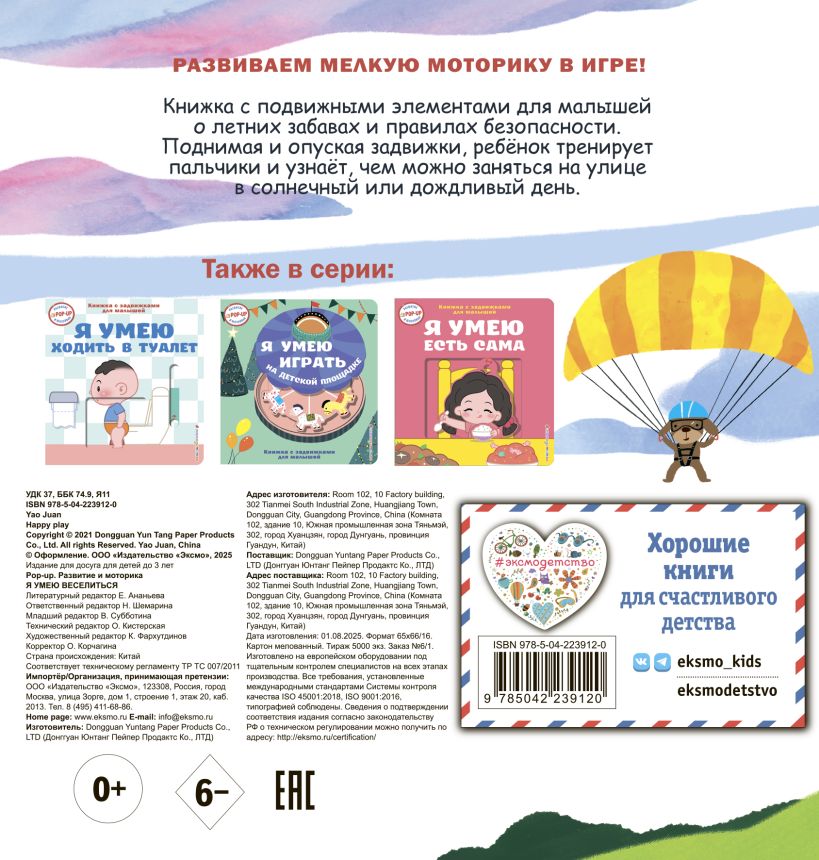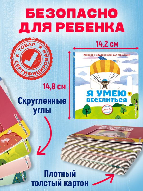 Все страницы и элементы книги имеют безопасную скруглённую форму и сделаны из прочного толстого картона — очень удобно для маленьких ручек! А компактный формат позволяет играть с книгой не только дома, но и легко брать её с собой на прогулку или в детский садик.