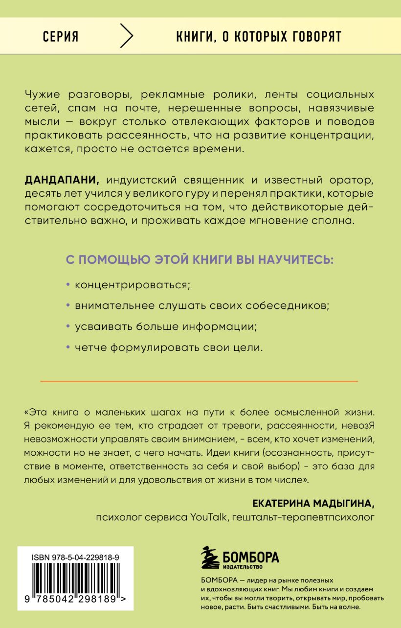 Дандапани десять лет учился у великого гуру и перенял практики, которые помогают сосредоточиться на том, что действительно важно и проживать каждое мгновение сполна. Благодаря этой книге вы научитесь внимательнее слушать своих собеседников, усваивать больше информации, четче формулировать свои цели и достигать их. Концентрация также поможет вам наслаждаться простыми радостями жизни — вкусной едой, общение с друзьями, чтением, отдыхом на природе.