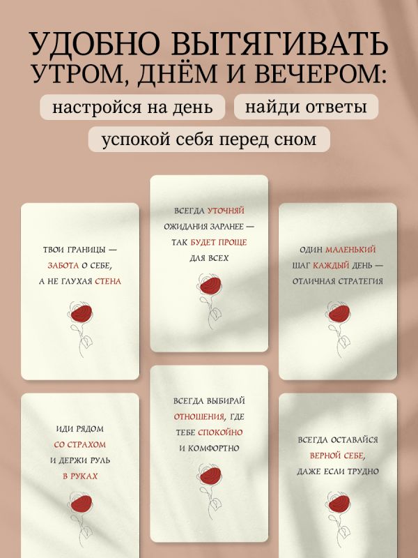 В самый шумный день, когда список дел распухает, а сердце сжимается от «надо», она находит в сумке маленькую колоду. Вытягивает карту наугад. «Ты можешь быть доброй и твердой одновременно». Слова ложатся тихо и точно — будто кто‑то бережно подставил плечо. Она делает вдох. И решает: сначала один ясный шаг.