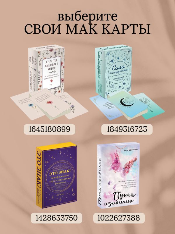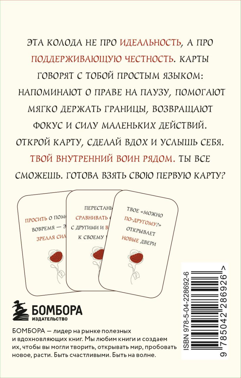 Колода «Я все смогу! Подсказки твоего внутреннего воина» — это не про идеальность, а про поддерживающую честность. Карты говорят с тобой простым языком: напоминают о праве на паузу, помогают мягко держать границы, возвращают фокус и силу маленьких действий. Их удобно вытягивать утром для настроя, днем — чтобы собрать себя, вечером — чтобы бережно закрыть день. Открой карту, сделай вдох и услышь себя. Твой внутренний воин рядом. Ты все сможешь.