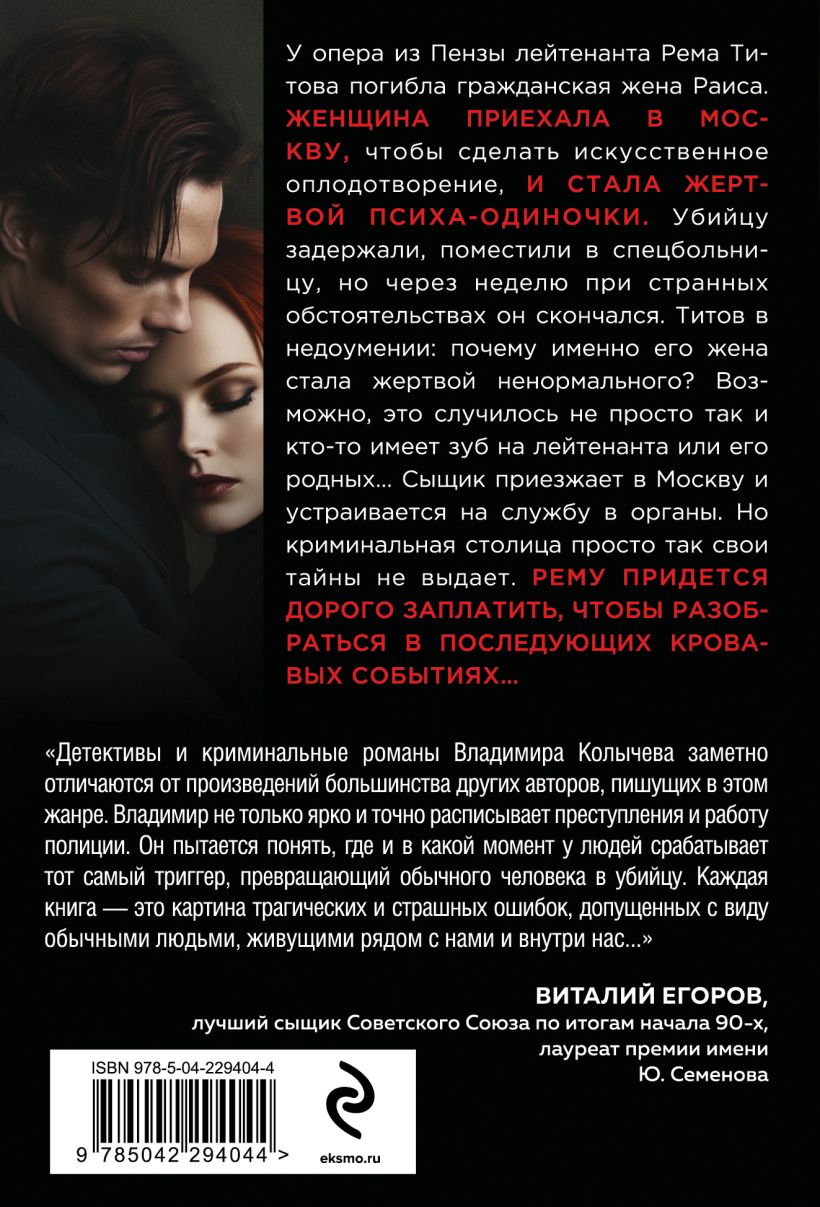 «Детективы и криминальные романы Владимира Колычева заметно отличаются от произведений большинства других авторов, пишущих в этом жанре. Владимир не только ярко и точно расписывает преступления и работу полиции. Он пытается понять, где и в какой момент у людей срабатывает тот самый триггер, превращающий обычного человека в убийцу. Каждая книга — это картина трагических и страшных ошибок, допущенных с виду обычными людьми, живущих рядом с нами и внутри нас...» — Виталий ЕГОРОВ, лучший сыщик Советского Союза по итогам начала 90-х, лауреат премии имени Ю. Семенова