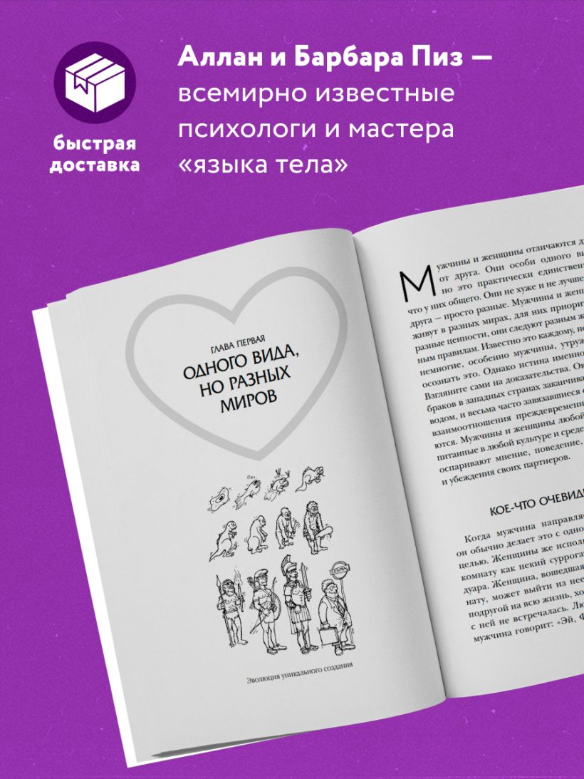 Мужчины и женщины с давних времен пытаются понять друг друга. Аллан и Барбара Пиз, всемирно известные психологи и счастливые супруги, учат читать представителей противоположного пола как открытую книгу. Они объясняют, почему мужчины не обращают внимания на детали, а женщинам так важны прикосновения. Рассказывают, как побудить мужчину к действию, а женщину — заставить замолчать. Помогают понять, из-за чего партнеры не уживаются друг с другом.
