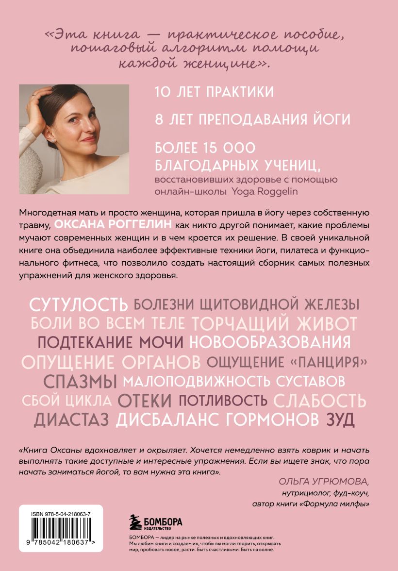 Автор книги Оксана Роггелин — преподаватель йоги, основательница онлайн-школы Yoga Roggelin и мама троих детей. Ее терапевтические комплексы помогут восстановить здоровье, справиться со стрессом, раскрыть свою женственность и сделать тело более эстетичным.