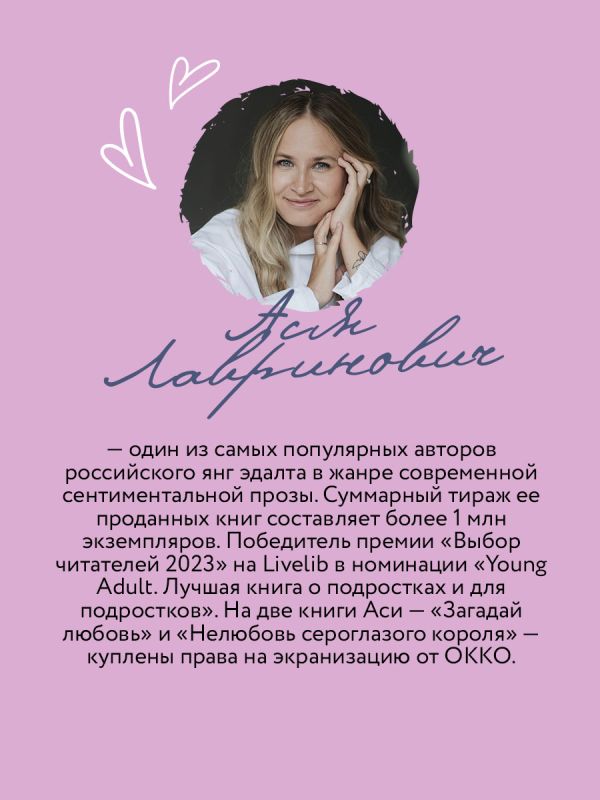 Ася Лавринович — один из самых популярных авторов российского янг эдалта в жанре современной сентиментальной прозы. Суммарный тираж ее проданных книг составляет более 1,6 млн экземпляров. Победитель премии «Выбор читателей 2023» на Livelib в номинации «Young Adult. Лучшая книга о подростках и для подростков». На две книги Аси — «Загадай любовь» и «Нелюбовь сероглазого короля» — куплены права на экранизацию от ОККО.