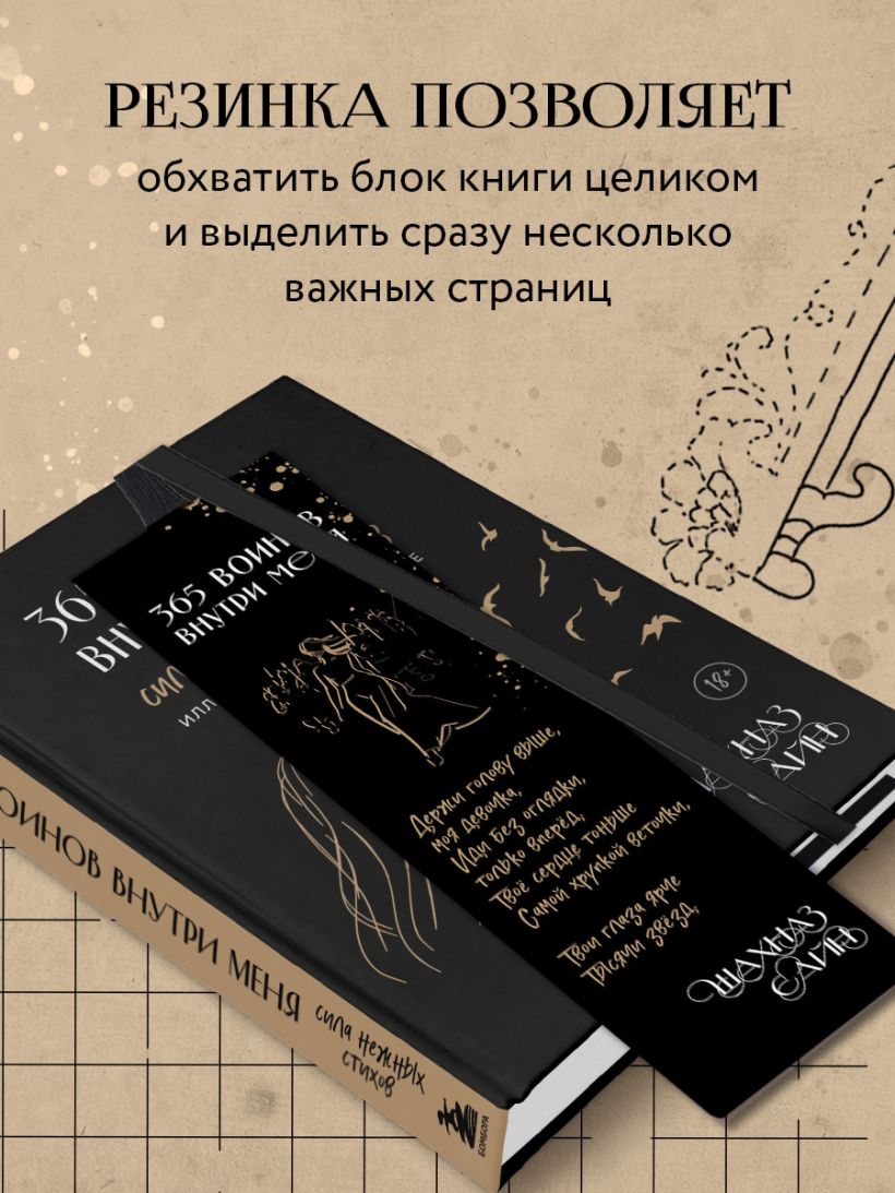 «Быть сильной и никогда не сдаваться» — это девиз Шахназ Сайн, автора абсолютных бестселлеров «Сила нежных стихов». Закладка с эстетичными артами от молодой поэтессы станет прекрасным подарком для всех любителей книг. Инновационный формат закладок с резинкой позволяет обхватить блок книги целиком и выделить сразу несколько важных страниц. Если вы с упоением погружаетесь в книжные миры, то закладка с резинкой для вас! Такие закладки станут надежным помощником для школьников, студентов и всех книжных фанатов. А стильные дизайны с невероятно эстетичными артами от автора поэтических сборников «365 воинов внутри меня» и «На минном поле расцвели сады» будут радовать глаз в перерывах между чтением! Отличный подарок для поклонников творчества Шахназ Сайн! Выходит в трех прекрасных оформлениях — выберите то, что по душе!