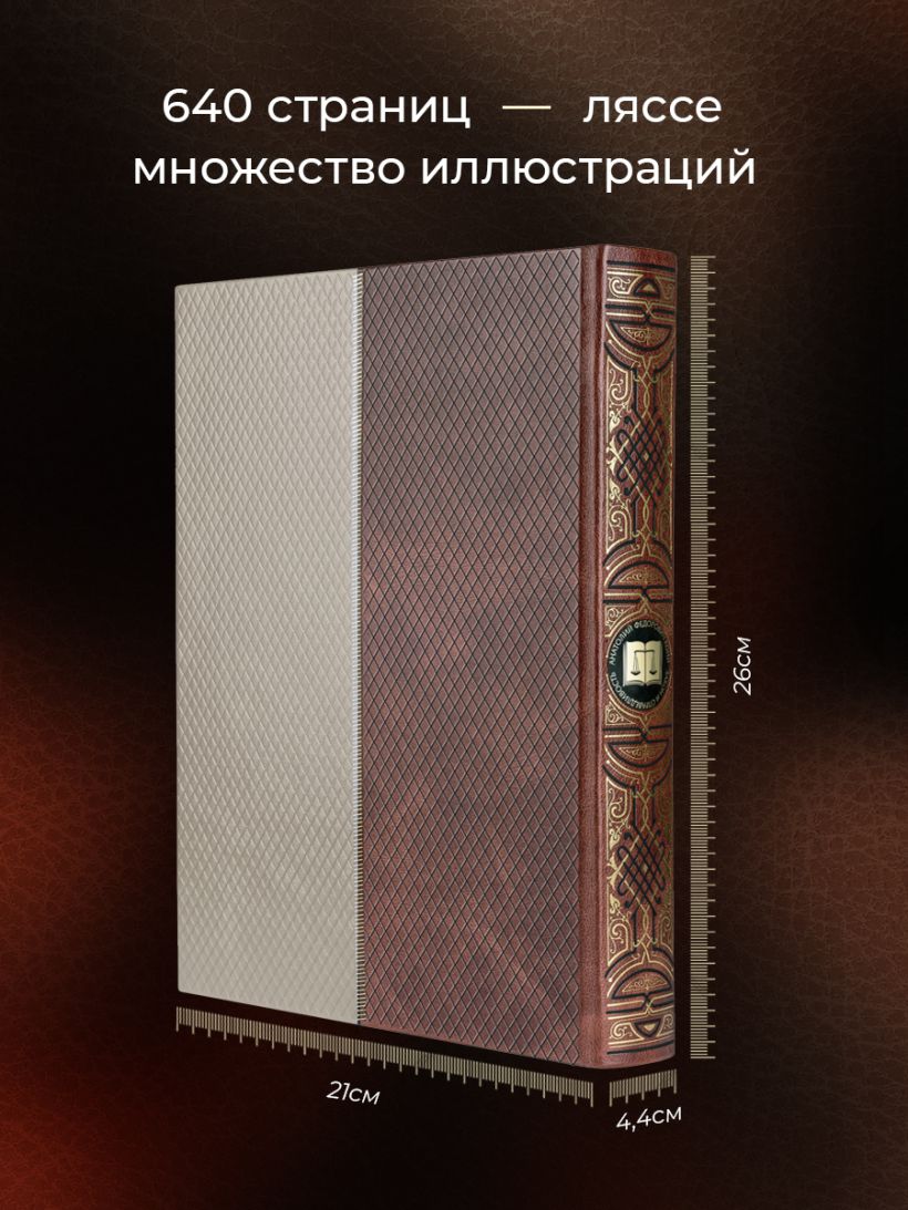 Книга в коллекционном инкрустированном переплёте. Переплет изготовлен их двух видов натуральной кожи по технологии 19 века и украшен сплошным тончайшим тиснением, в полном соответствии с лучшими образцами переплетов европейских мастеров. В оформлении переплета использованы универсальные растительно-геометрические плетёные орнаменты, благодаря им книга будет отлично смотреться на любой книжной полке. Лента для закладывания страниц и каптал, скрепляющий верх и низ объемного тома, изготовлены из шелка. Бумага в книге легкая, матовая, что обеспечивает комфортное чтение даже длительное время, иллюстрации напечатаны на высокобелой мелованной бумаге. Обрез книги вызолочен вручную. Книга помещена в прочный футляр с магнитным замком и шелковой лентой, облегчающей вынимание. На крышке футляра тисненая золотом марка серии. К книге прилагается красочный сертификат, подтверждающий уникальность издания, он вложен в каждый экземпляр экземпляр и пронумерован вручную.