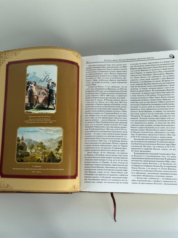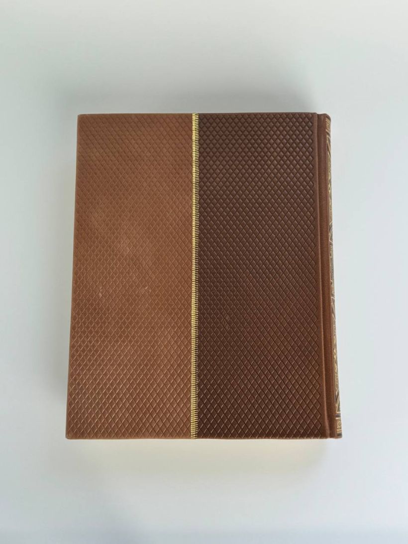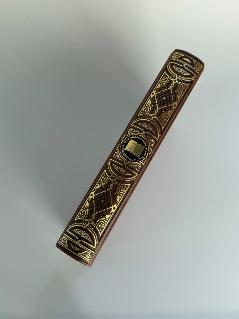 Книга в коллекционном инкрустированном переплете. Переплет изготовлен их двух видов натуральной кожи по технологии XIX века и украшен сплошным тончайшим тиснением, в полном соответствии с лучшими образцами переплетов европейских мастеров. Использовано 3 вида тиснения — золото,черный натуральный пигмент и рельефное тиснение. В оформлении переплета использованы универсальные растительно-геометрические плетеные орнаменты, благодаря им книга будет отлично смотреться на любой книжной полке. Лента для закладывания страниц и каптал, скрепляющий верх и низ объемного тома, изготовлены из шелка. Бумага в книге легкая, матовая, что обеспечивает комфортное чтение даже длительное время, иллюстрации напечатаны на высокобелой мелованной бумаге. Обрез книги торшонирован, окрашен в цвет слоновой кости и вызолочен вручную.