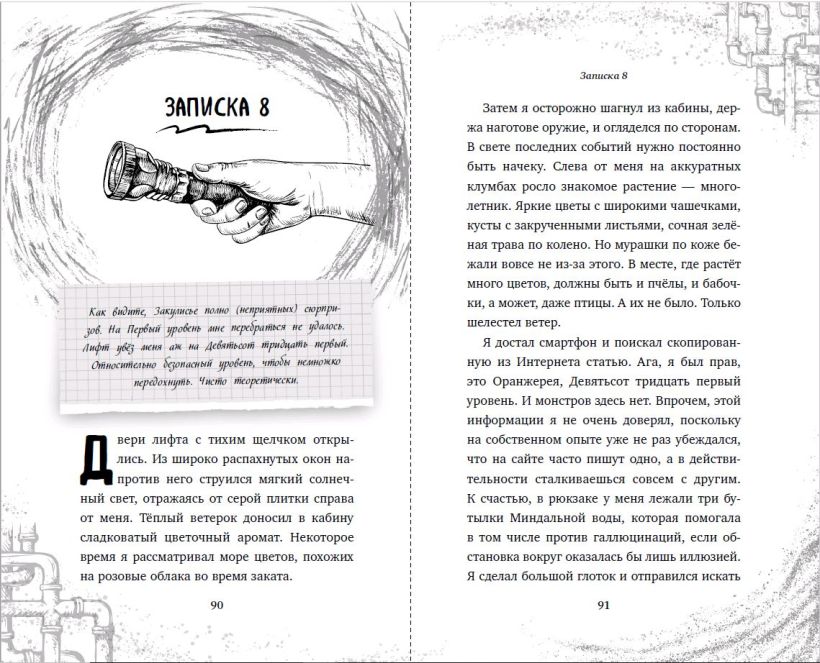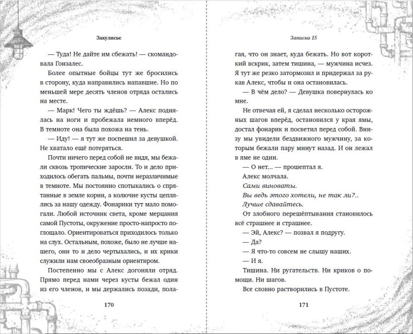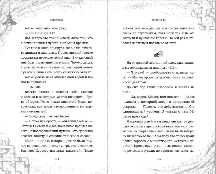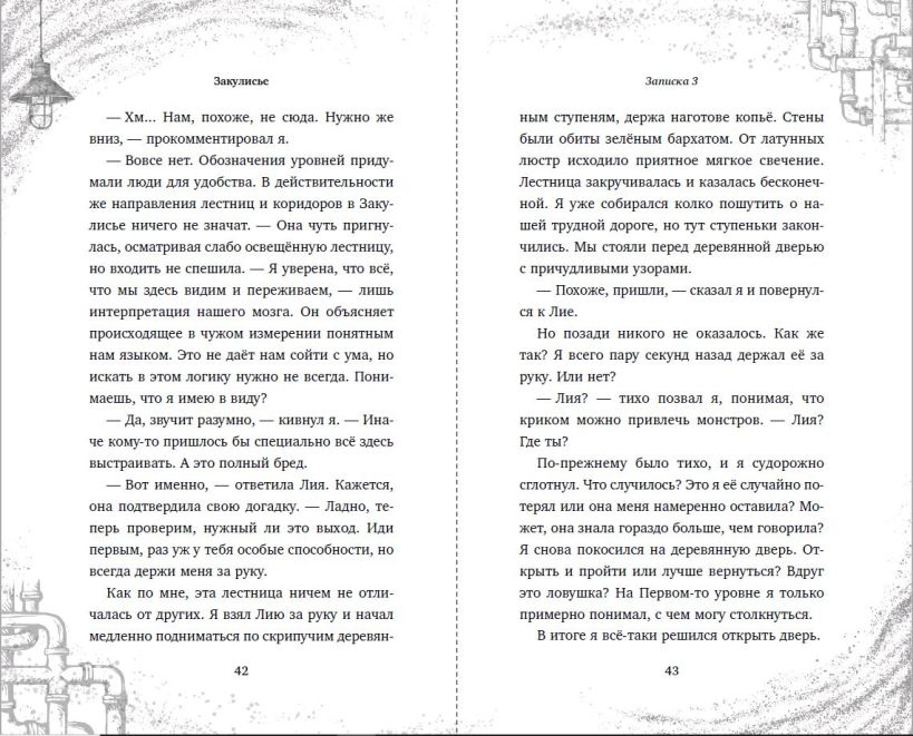 Множество необычных локаций в уникальной вселенной Закулисья — оранжерея, пригород, заброшенные дома — и монстры, которые поджидают за каждым поворотом. Классная обложка и внутреннее оформление в хоррор-стилистике. Записки от первого лица и ч/б иллюстрации перед главами помогают полностью погрузиться в историю. Захватывающая книга, от которой невозможно оторваться до последней страницы!