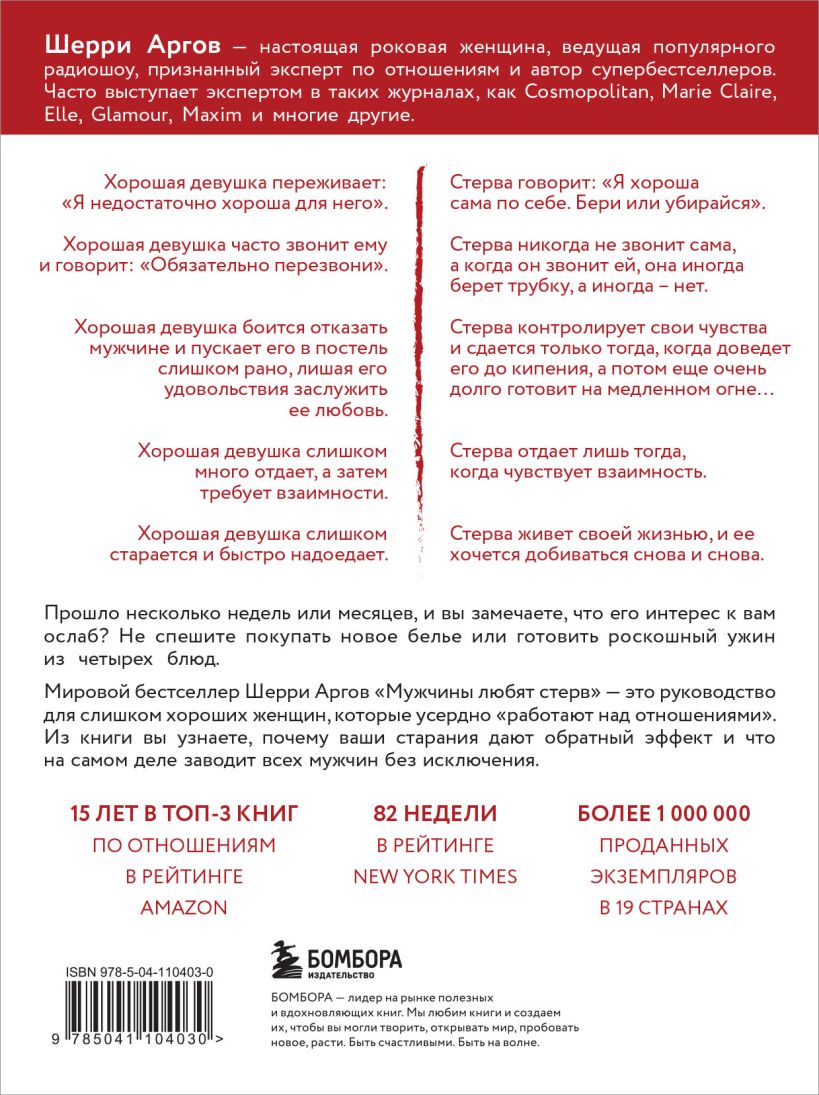 Мировой бестселлер Шерри Аргов «Мужчины любят стерв» — это руководство для слишком хороших женщин, которые усердно «работают над отношениями». Из книги вы узнаете, почему ваши старания дают обратный эффект и что на самом деле заводит всех мужчин без исключения. 100 принципов привлекательности, которые сформулировала для вас Шерри, помогут вам всегда оставаться для него женщиной мечты, которую необходимо добиваться вновь и вновь. И вы сможете развивать ваши отношения по своему собственному сценарию.