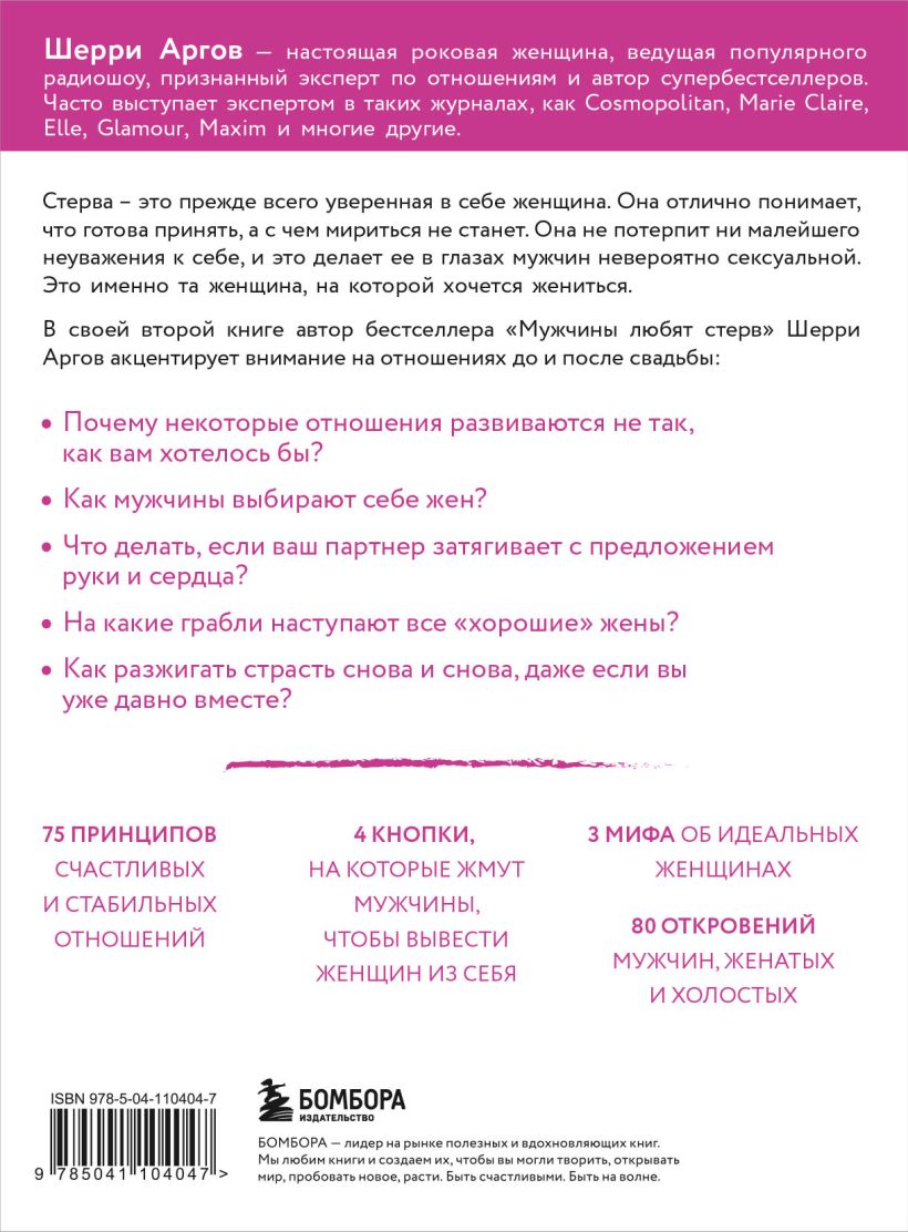 В своей второй книге Шерри Аргов акцентирует внимание на отношениях до и после свадьбы. Почему некоторые отношения развиваются не так, как вам хотелось бы? Как мужчины выбирают себе жен? Что делать, если ваш партнер затягивает с предложением руки и сердца? На какие грабли наступают все «хорошие» жены? Как разжигать страсть снова и снова, даже если вы уже давно вместе?