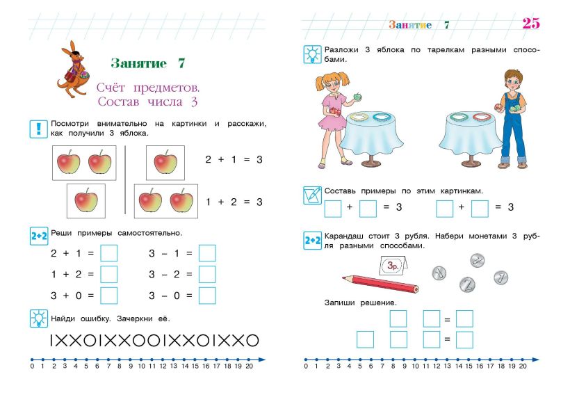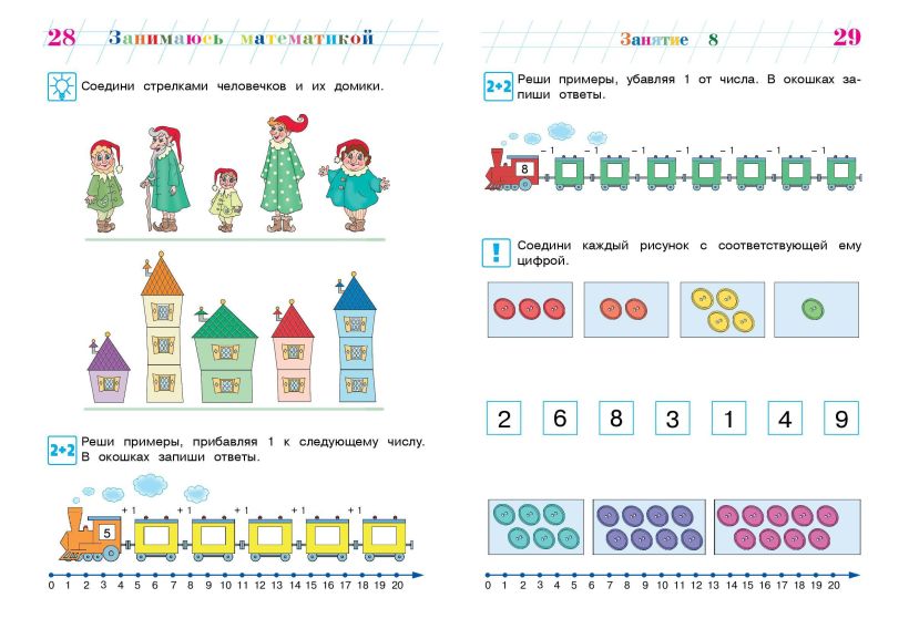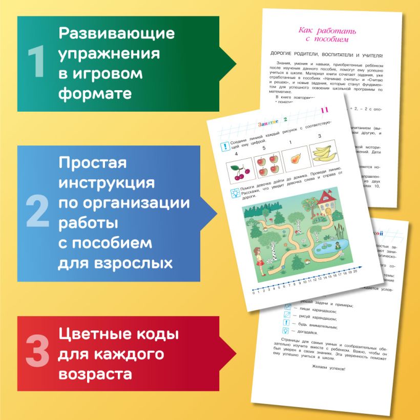 Выполняя интересные игровые задания, ребенок повторит состав числа, будет решать примеры и задачи на сложение и вычитание с помощью числовой прямой в пределах 20, познакомится с четными и нечетными числами, углами, отрезками, плоскими и объемными фигурами, научится считать десятками, потренируется в определении времени по часам. Кроме того, для детей, успешно справившихся с основными упражнениями, в книге предлагаются более сложные задания — счет до 100, примеры с двузначными числами. Знания, умения и навыки, которые дошкольник приобретет в результате занятий, позволят ему почувствовать уверенность в себе и в дальнейшем их успешно использовать. В конце пособия имеются методические рекомендации, которые подскажут, как правильно организовать занятие с ребенком.