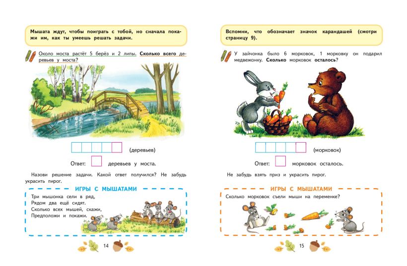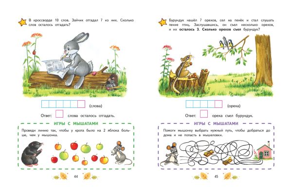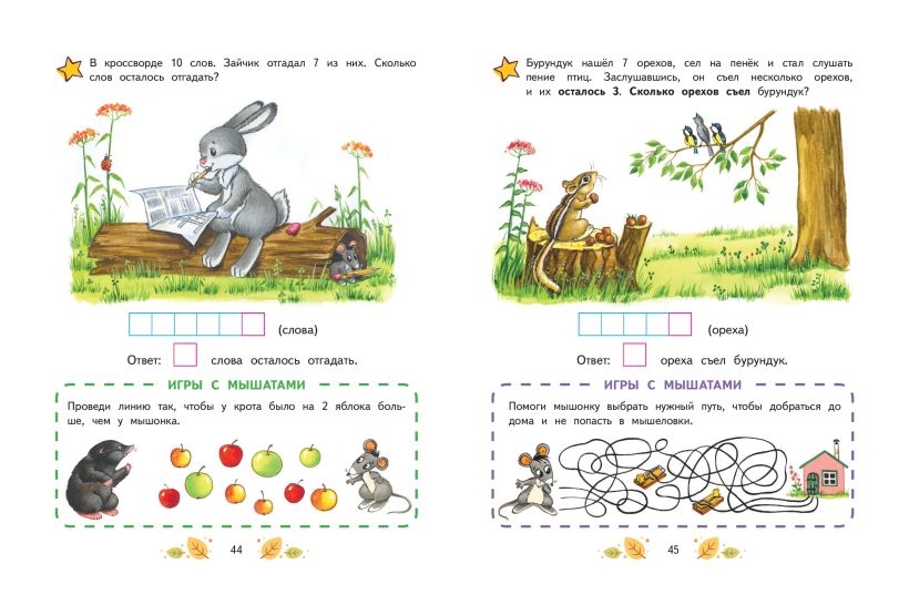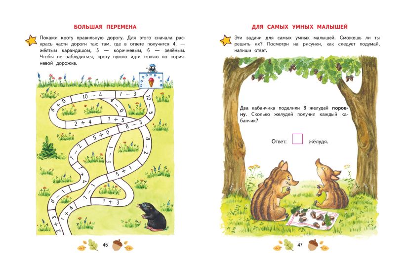 Занимательные сюжеты превратят занятие в увлекательную игру: дошкольнику наверняка понравятся истории, происходящие в сказочном лесу, и он захочет получать понравившуюся ягодку за каждую решенную задачу и украсить ими праздничный пирог.