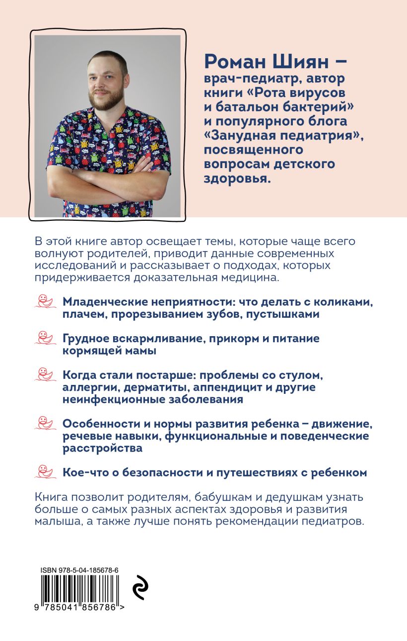 ЗАНУДНАЯ ПЕДИАТРИЯ: В книге автор освещает самые разные темы, связанные с неинфекционными заболеваниями и расстройствами у детей, которые наиболее часто беспокоят его пациентов и читателей. Для чего младенца выкладывают на животик? Как лечат крапивницу, аллергический ринит и диарею? Что делать, если ребенка укачивает в транспорте или ужалила медуза? Какие симптомы бывают при воспалении аппендицита? Доктор Роман Шиян просто и понятно отвечает на эти и многие другие вопросы, приводит данные исследований и знакомит с современными подходами к терапии. После прочтения этой книги вы не станете врачом, однако она может позволить вам более осознанно относиться к здоровью своих детей, снизить уровень тревожности и иметь представление, почему врачи дают вам те или иные рекомендации и чего ожидать в дальнейшем.