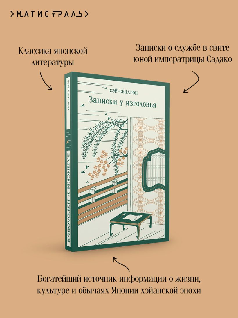 «Записки у изголовья» — шедевр классической японской литературы, созданный около тысячи лет тому назад и до сих пор не утративший своего значения. Это собрание дневниковых заметок, философских размышлений, картин природы, нравов и обычаев, оригинальных психологических этюдов. Автор записок — придворная дама Сей-Сёнагон, зорко видящая прекрасное в природе, искусстве и жизни.