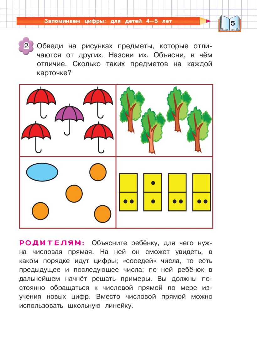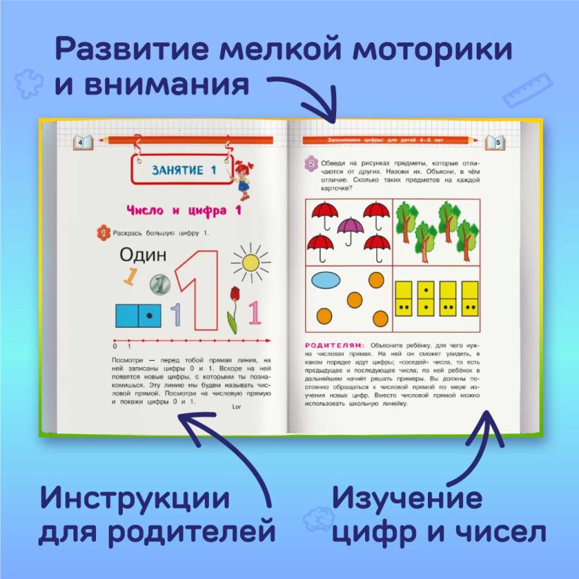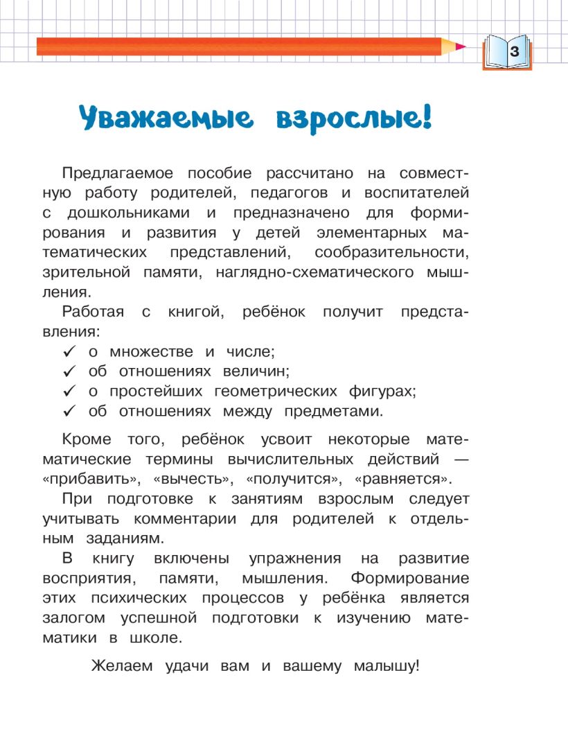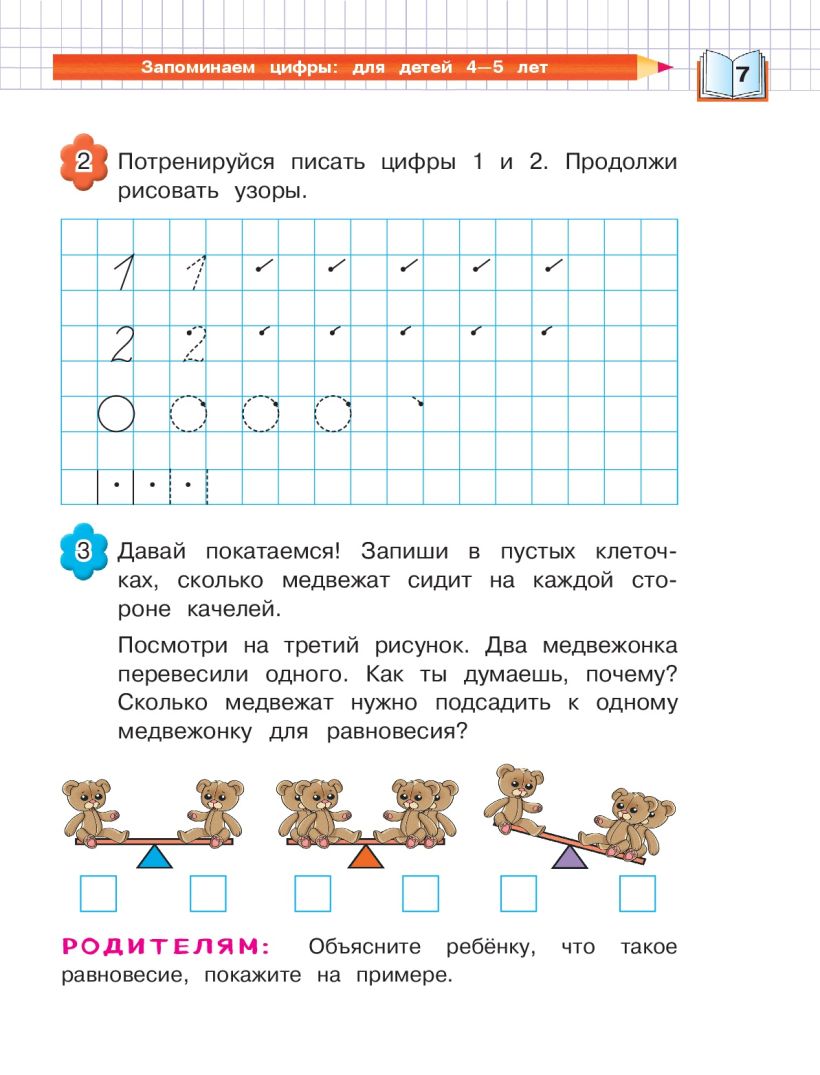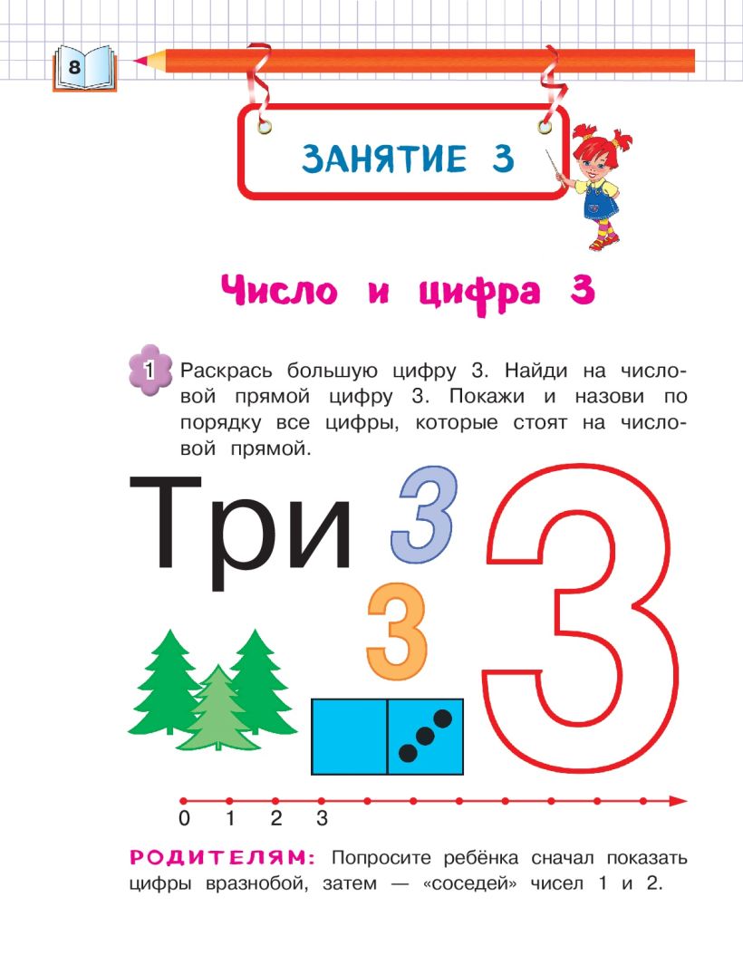 Занимаясь, ребёнок научится различать цифру и число, сравнивать предметы по количеству, рисовать узоры и писать цифры в клетках; получит представление о простейших геометрических фигурах; потренирует навык счета; сможет развить внимание, мышление, память, моторику; а также усвоит такие математические термины, как «прибавить», «вычесть», «получится», «равняется». Кроме того, при подготовке к занятиям взрослым необходимо учитывать комментарии для родителей к отдельным заданиям, которые помогут оптимизировать обучающий процесс.