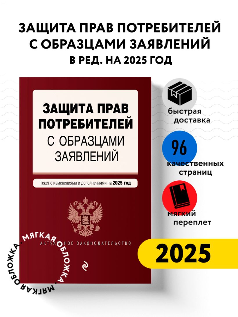 Удобное издание для потребителей: ссодержит текст Закона РФ «О защите прав потребителей» со всеми изменениями и дополнениями по состоянию на 2025 год, а также примерные (типовые) формы исковых и других заявлений (о расторжении договоров, взыскании денежных средств, возмещении убытков, неустойки, морального вреда), которые помогут потребителям правильно составить документы при обращении в компетентные органы для защиты своих интересов при приобретении товаров ненадлежащего качества и небезопасных для жизни и здоровья.