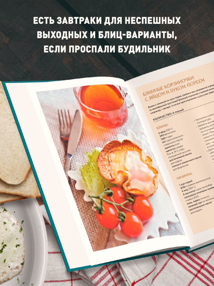 Под обложкой вас ждут 62 рецепта, чтобы бодро начать утро: блины и оладушки, вафли, каши, тосты, гранола и смузи для тех, кто торопится.