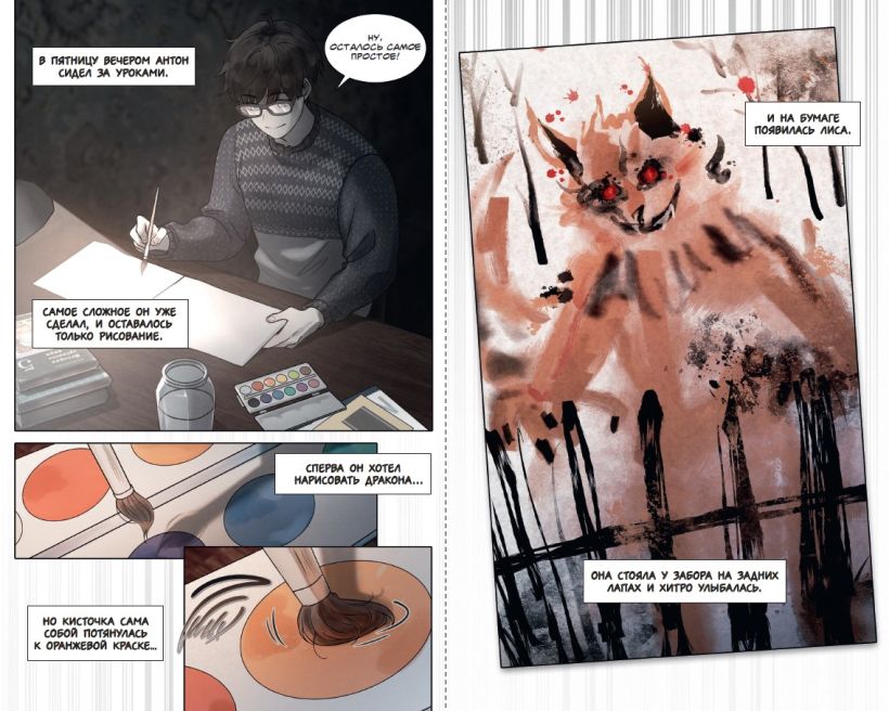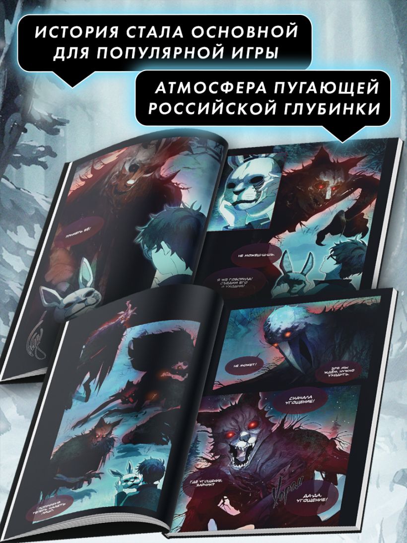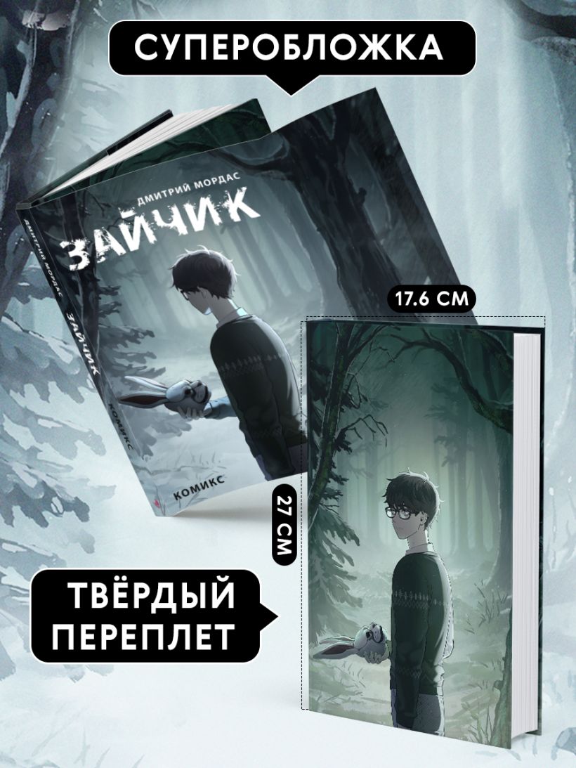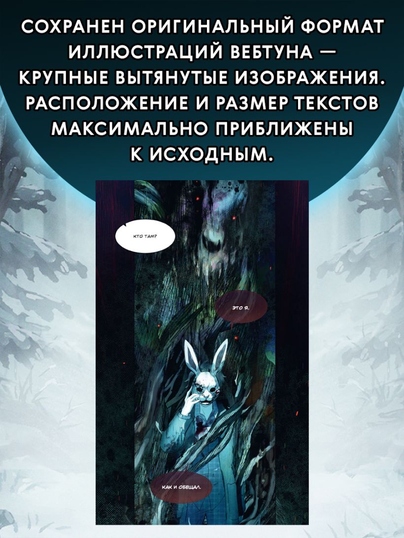 Стильное оформление, концептуальная обложка, пугающая атмосферная история, а также уникальный дополнительный материал в конце книги — все это ждет вас в комиксе «Зайчик», который имеет еще и формат вебтуна!
