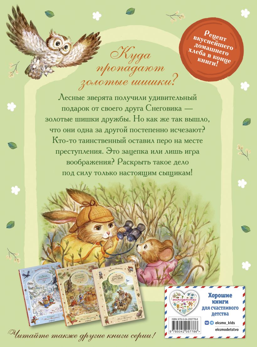 Волшебная история для всей семьи о лесных зверятах, расследующих тайну исчезновения золотых шишек! Устройте себе уютный вечер, читая об отважных и дружных животных и любуясь невероятными акварельными иллюстрациями на мелованной бумаге, в которых важна каждая деталь. А после приготовьте вкуснейший домашний хлеб по рецепту в конце книги.