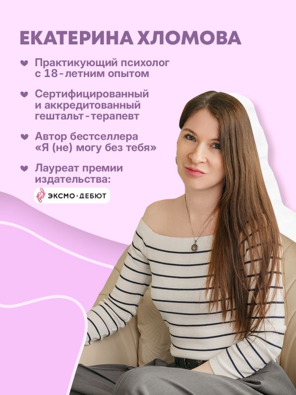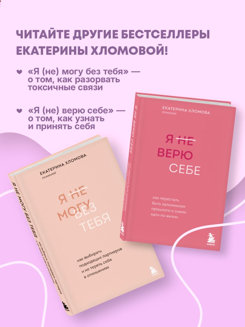 Екатерина Хломова — психолог с 18-летним опытом и автор бестселлеров, которые читательницы называют «терапией в книжном формате». Ее книга «Я (не) могу без тебя» помогает разорвать токсичные связи, «Я (не) верю себе» — узнать и принять себя. Теперь пришло время научиться строить здоровые и счастливые отношения.