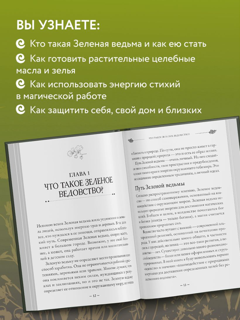 Зеленая ведьма знает все про травы, боготворит природу, работает над внутренним равновесием и помогает окружающему миру. Это особенная Зеленая магия для Зеленой ведьмы. Жизнь в согласии с природой не подразумевает под собой отказ от достижений цивилизации — наоборот: Зеленая ведьма ловко и умело соединяет жизнь в существующих реалиях со знаниями прошлого. Она наполняет дом и все вокруг себя благоприятной энергией, готовит масла из всевозможных растений.