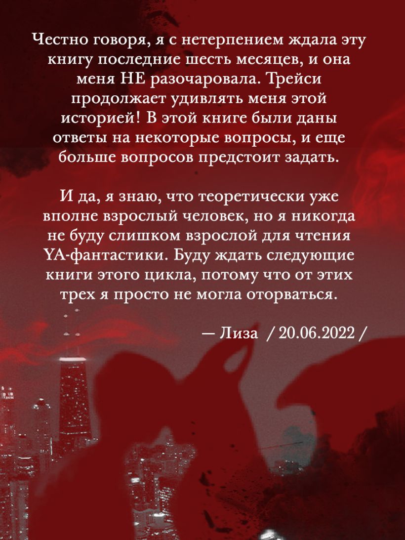 Мы разные. Я — успешный конфликтолог, он — каратель, чье лицо последним видят серийные убийцы. У меня популярное агентство по решению межвидовых проблем, знакомства в высшем обществе Нового Вавилона. У него — социопатия, сверхспособности и черные крылья. Мои враги не прочь стать близкими друзьями. Его враги отрывают головы за косой взгляд. Мы не должны были встретиться. Но однажды… 1. Вам любопытно, каким будет мир после победы над рептилоидами? Спойлер: после апокалипсиса скучать не придется! 2. Желаете прогуляться по Новому Вавилону, городу, где чары — не сказки, а ежедневная рутина, порой опасная для жизни? 3. Вам нравится, когда сверхъестественное — часть системы: маги принимают законы, оборотни расследуют преступления, ведьмы варят зелье делового успеха, вампиры сверкают не на солнце, а на заседании городского совета? 4. Хотите познакомиться с харизматичным плохишом Максом? Он твердит, что ангел, а на самом деле крылатый кошмар преступников. 5. Вам симпатичны героини, которые не ждут принца, а строят свое счастье сами, попутно разруливая чужие конфликты? Обаятельная Саша — не дева в беде, а переговорщик с красным дипломом. 6. Любите следить за отношениями, которые начинаются со взаимной неприязни? Встреча героев как взрыв в лаборатории алхимика: внезапно, ярко и с неожиданными последствиями! 7. Предпочитаете фэнтези, где есть темные тайны, интриги опаснее зловредных чар, а истинная любовь дарит крылья и свободу?