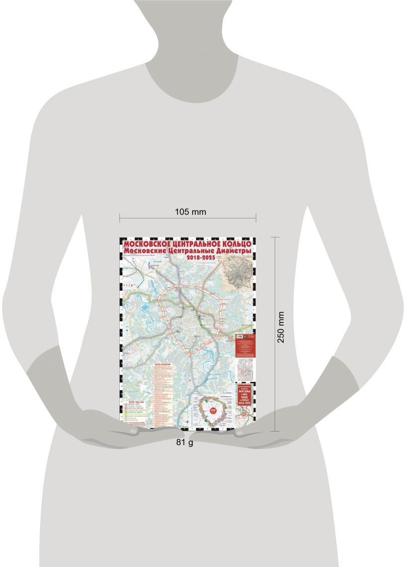 Карта Московского центрального кольца в масштабе на плане карты города, обозначены пересадочные узлы, где пассажиры смогут пересесть с одного вида транспорта на другой, а также пункты пересечения кольцевой железной дороги с радиальными магистралями. Также на карте отражены строящиеся участки линий метро. На обороте: автомобильная карта Московской области.