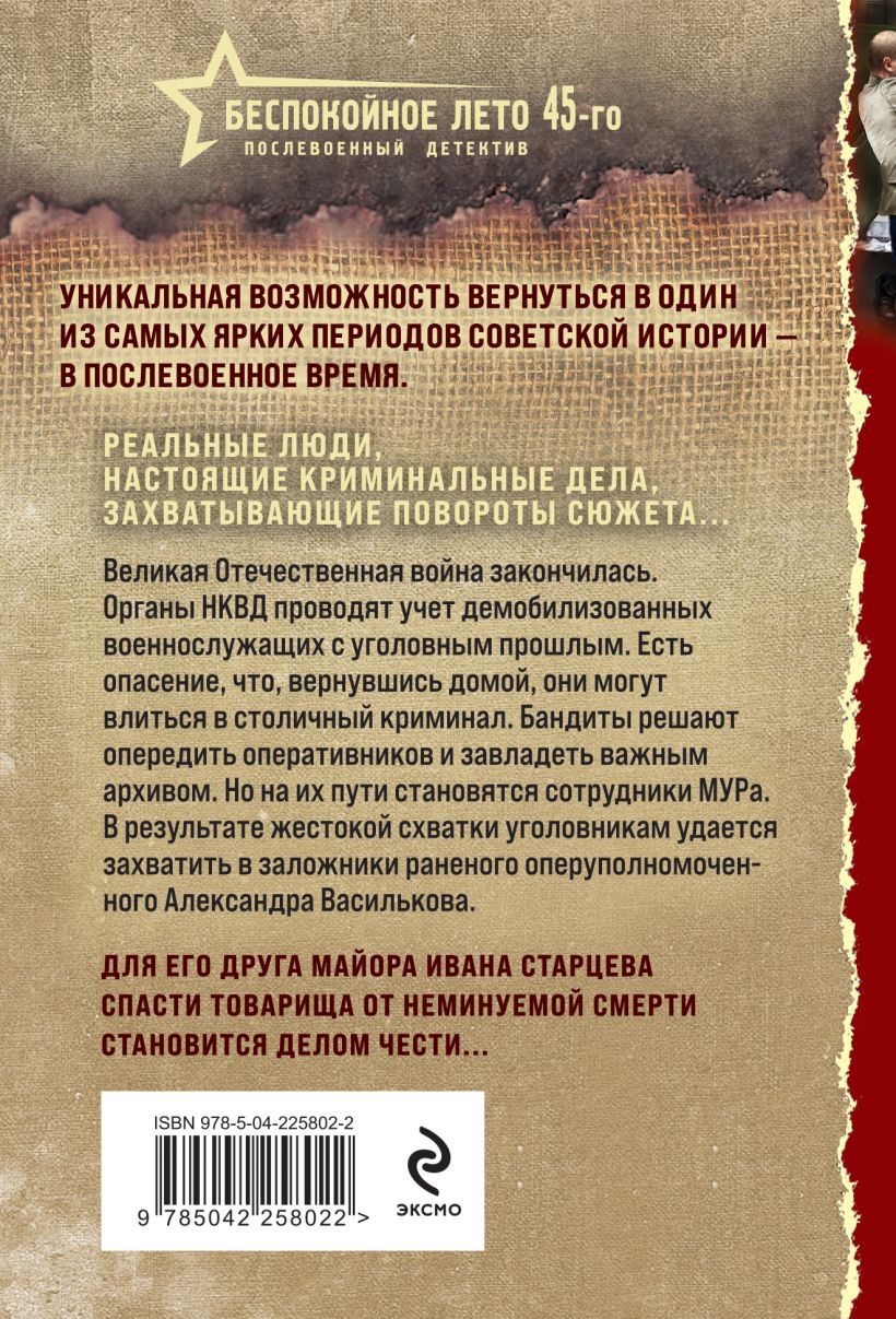 Великая Отечественная война закончилась. Органы НКВД проводят учет демобилизованных военнослужащих с уголовным прошлым. Есть опасение, что, вернувшись домой, они могут влиться в столичный криминал. Бандиты решают опередить оперативников и завладеть важным архивом. Но на их пути становятся сотрудники МУРа. В результате жестокой схватки уголовникам удается захватить в заложники раненого оперуполномоченного Александра Василькова. Для его друга майора Ивана Старцева спасти товарища от неминуемой смерти становится делом чести…