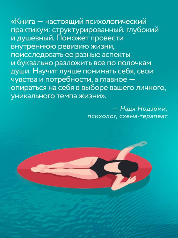 «Книга — настоящий психологический практикум: структурированный, глубокий и душевный. Поможет провести внутреннюю ревизию жизни, поисследовать ее разные аспекты и буквально разложить все по полочкам души. Научит лучше понимать себя, свои чувства и потребности, а главное — опираться на себя в выборе вашего личного, уникального темпа жизни». — Надя Нодзоми, психолог, схема-терапевт