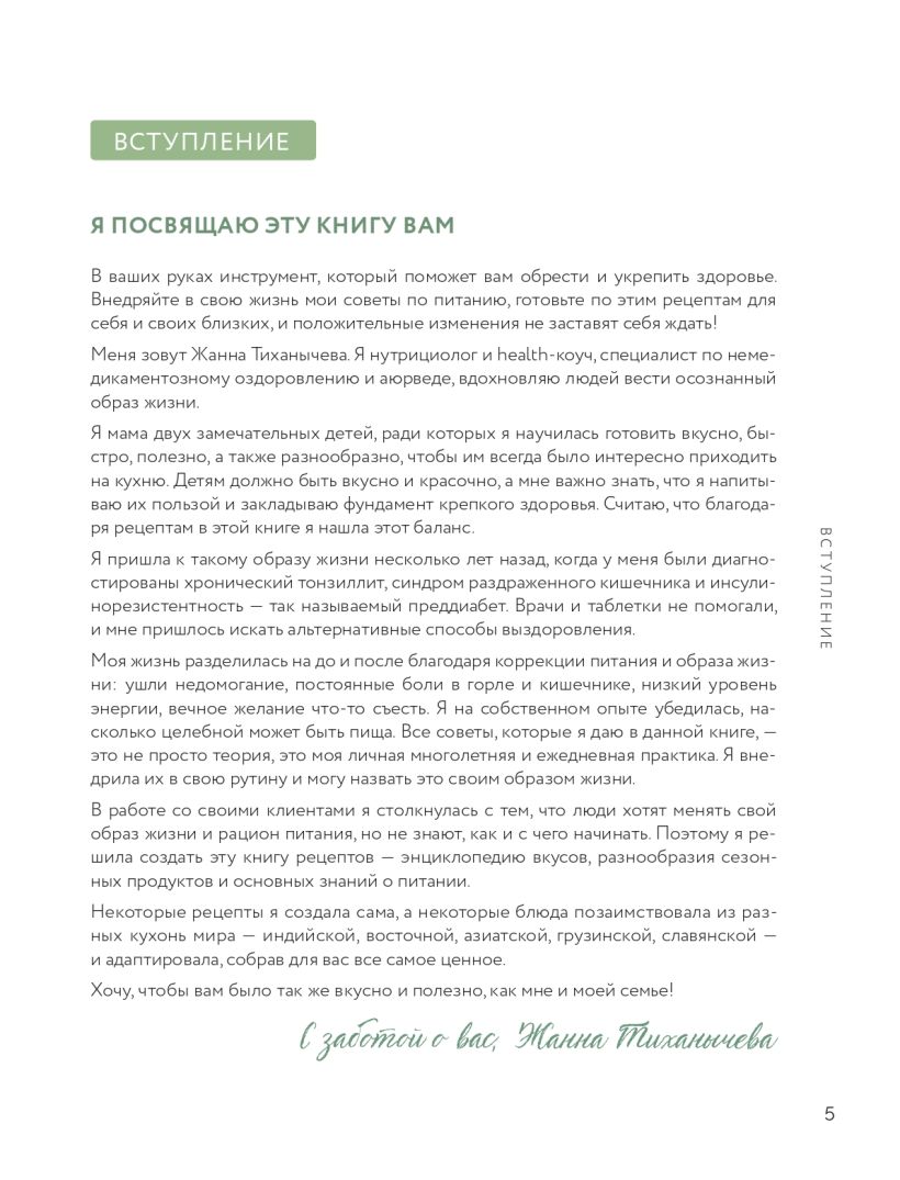 Жанна Тиханычева — нутрициолог и health-коуч, специалист по немедикаментозному оздоровлению и аюрведе. Ее новая книга — это не просто кладезь ценных знаний о здоровом питании, а целая энциклопедия вкусов. В книге вы найдете как авторские рецепты, так и блюда разных кухонь мира — индийской, восточной, азиатской, грузинской, славянской. Автор адаптировала их, собрав для вас все самое ценное.