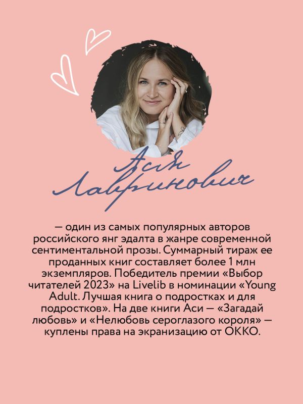 Ася Лавринович — один из самых популярных авторов российского янг эдалта в жанре современной сентиментальной прозы. Суммарный тираж ее проданных книг составляет более 1 млн экземпляров. Победитель премии «Выбор читателей 2023» на Livelib в номинации «Young Adult. Лучшая книга о подростках и для подростков». На две книги Аси — «Загадай любовь» и «Нелюбовь сероглазого короля» — куплены права на экранизацию от ОККО.