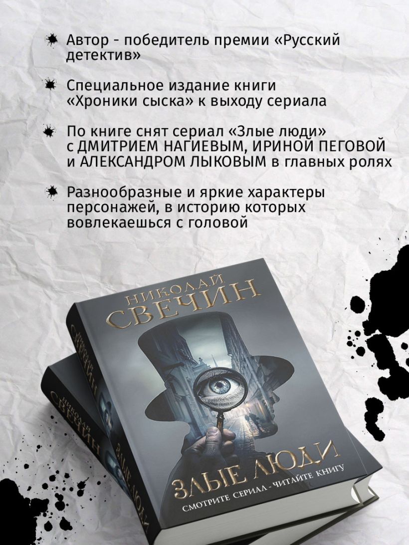 По самой любимой читателями книге Николая Свечина «Хроники сыска» снят сериал «Злые люди». В главных ролях: Пётр Рыков, Александр Лыков, Ян Цапник, Дмитрий Нагиев, Роман Мадянов, Ирина Пегова. На обложке представлен постер сериала.