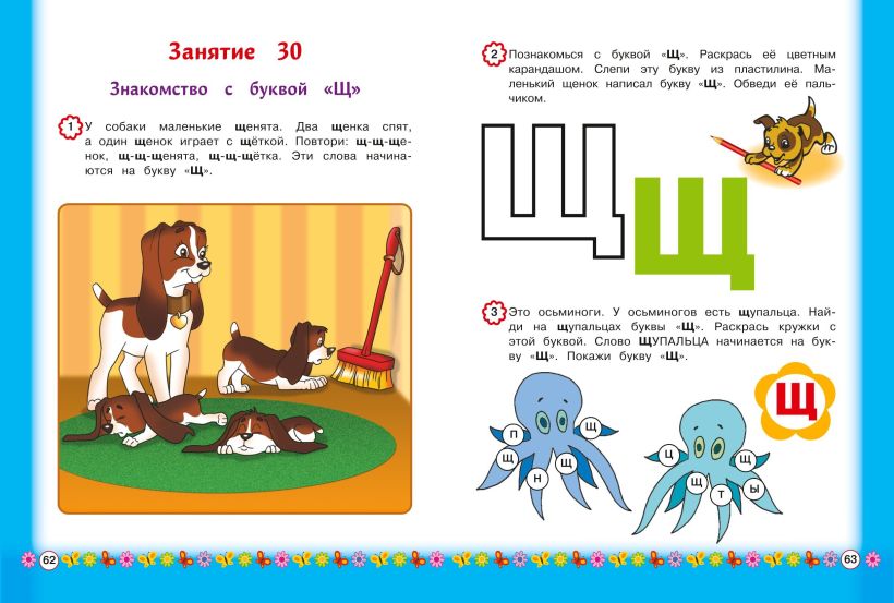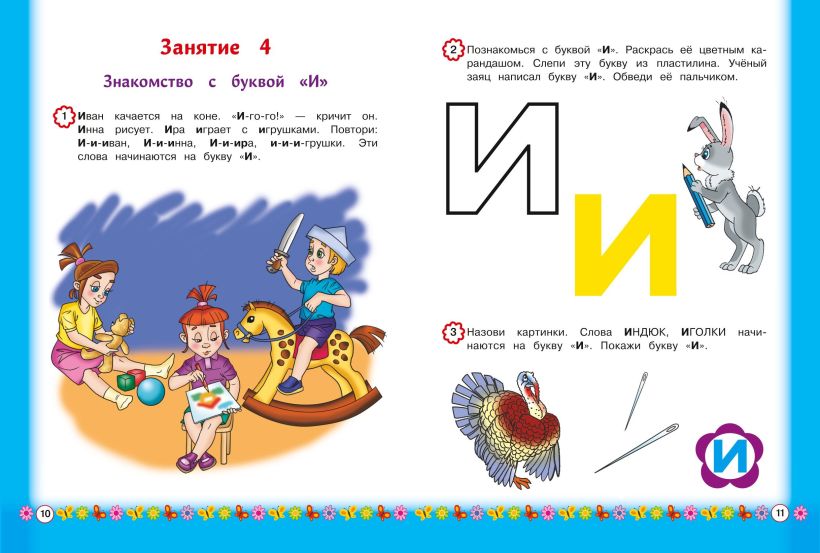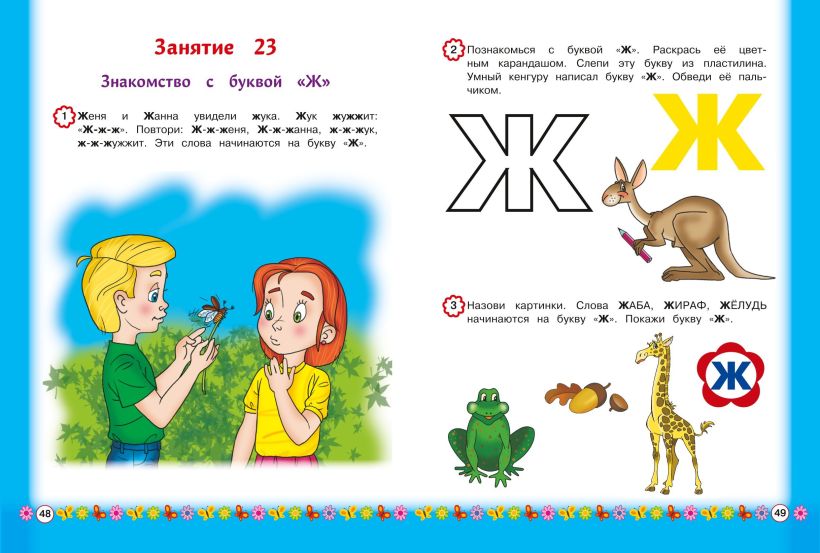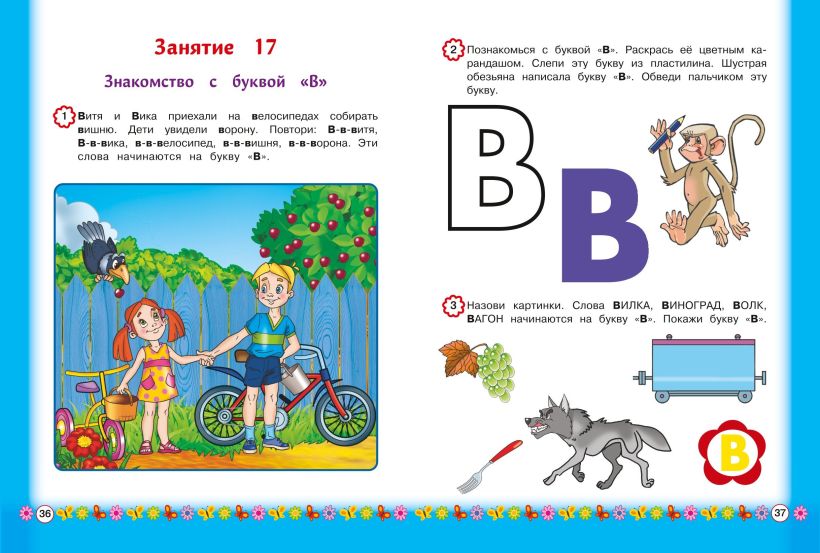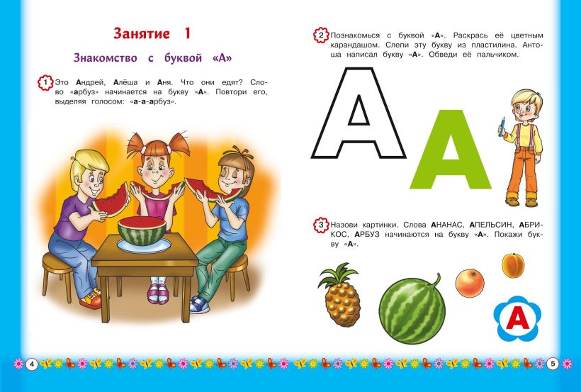 Весёлые красочные картинки и разнообразные графические упражнения сформируют у малыша зрительный образ каждой буквы, научат его различать похожие по начертанию буквы. Для этого предлагаются наиболее эффективные приёмы работы: раскрашивание, обведение по пунктиру и лепка букв из пластилина, нахождение буквы среди графически сходных букв.