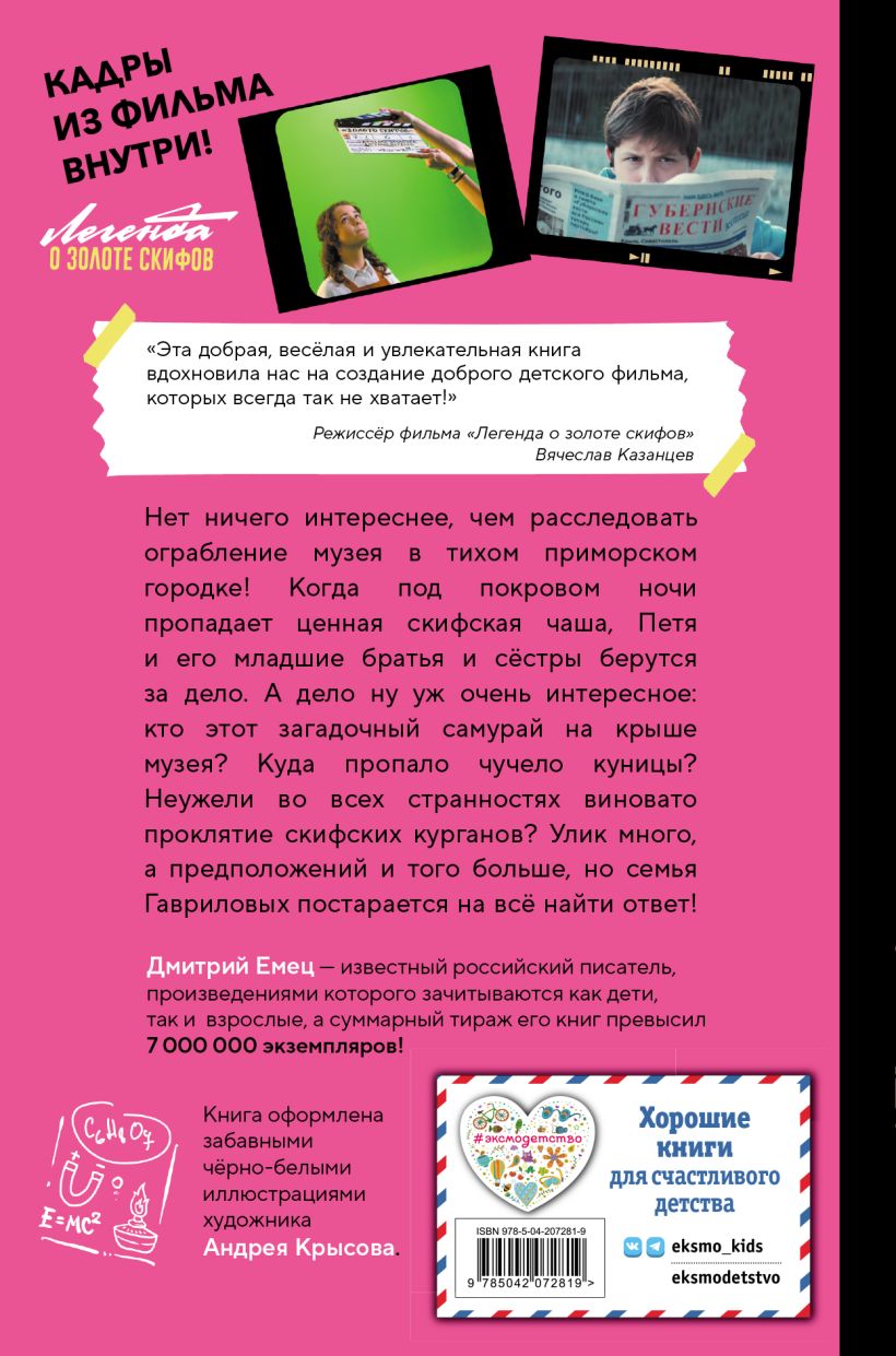 Нет ничего интереснее, чем расследовать ограбление музея в тихом приморском городке! Когда под покровом ночи пропадает ценная скифская чаша, Петя и его младшие братья и сестры берутся за дело. А дело ну уж очень интересное: кто этот загадочный самурай на крыше музея? Куда пропало чучело куницы? Неужели во всех странностях виновато проклятие скифских курганов? Улик много, а предположений и того больше, но дружная семья Гавриловых постарается на всё найти ответ!