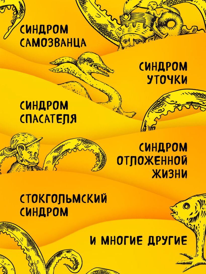 В него вошли статьи как про всем известные синдромы, вроде самозванца, отличника и спасателя, так и про те, о которых редко можно прочитать в открытых источниках. Например, о синдроме сбитого летчика, пустого гнезда, мачехи принцессы или уточки.