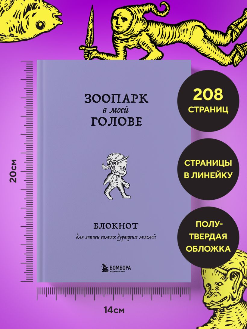 Блокнот по мотивам бестселлера "Зоопарк в твоей голове". Внутри — страницы в линейку для гениальных (и не очень) идей, странных инсайтов, неожиданных озарений и любых слов, которым пора выбраться наружу. А на полях вас подстерегают фантастические существа, такие же причудливые, как ваши мысли.