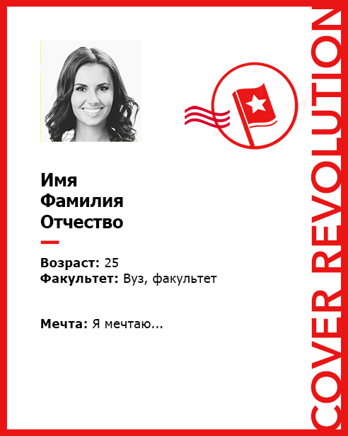 1) фото (фотографию разместить вместо прямоугольника) 2) информация об авторе: ФИО, возраст, вуз, факультет 3) ответ на вопрос, о чем я мечтаю (одно-два предложения)